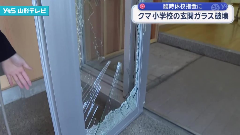 南陽市でクマ 赤湯小の玄関ガラス 割る