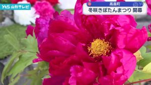 高畠町で冬咲きぼたんまつり開幕 雪景色彩る
