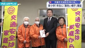 天童市交通安全母の会、新小学1年生と新中学1年生1008人に黄色い帽子や反射ストラップなど交通安全用品を贈呈