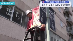 プロ野球開幕を前に山形市で楽天イーグルスの応援フラッグ掲出。アンバサダーの銀次さん、岡島さんも参加し日本一を誓う。