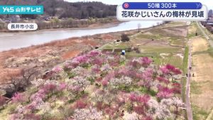 長井市の梅林公園 約300本の梅が見頃に 例年より早く春の便り 多くの花見客で賑わう