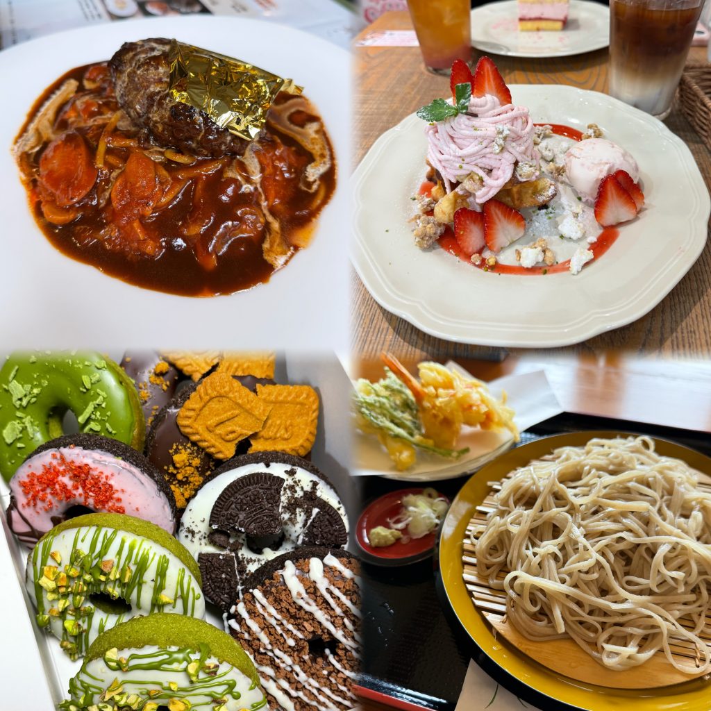 (金箔ハンバーグ・桜スイーツ・ドーナツ・蕎麦)