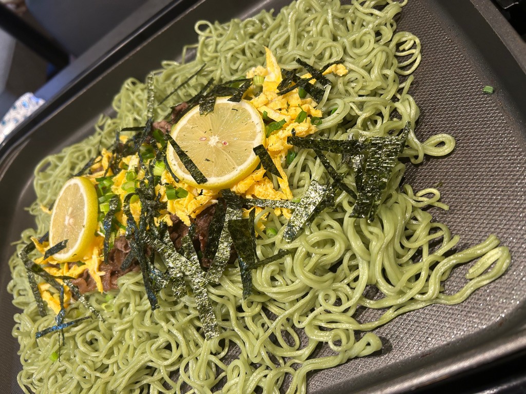 初日の夜は、父方のルーツである山口県の「瓦そば」ならぬホットプレートそば。