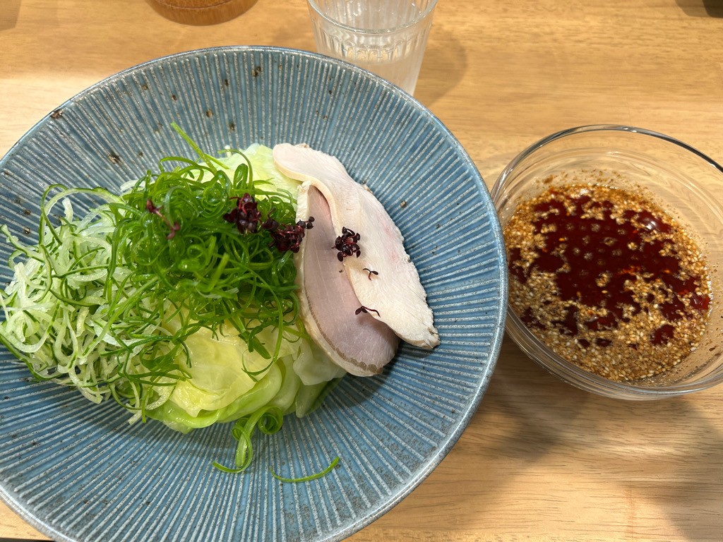 ゆでたキャベツに大量のネギ。冷たく辛いたれにつけて食べるのが広島のつけ麺