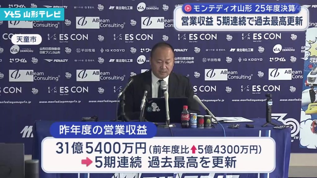 モンテディオ山形の相田健太郎社長は会見を開き、25年度の売り上げにあたる営業収益が31億5400万円と前の年度から5億4300万円増え、5期連続で過去最高を更新したことを発表しました。