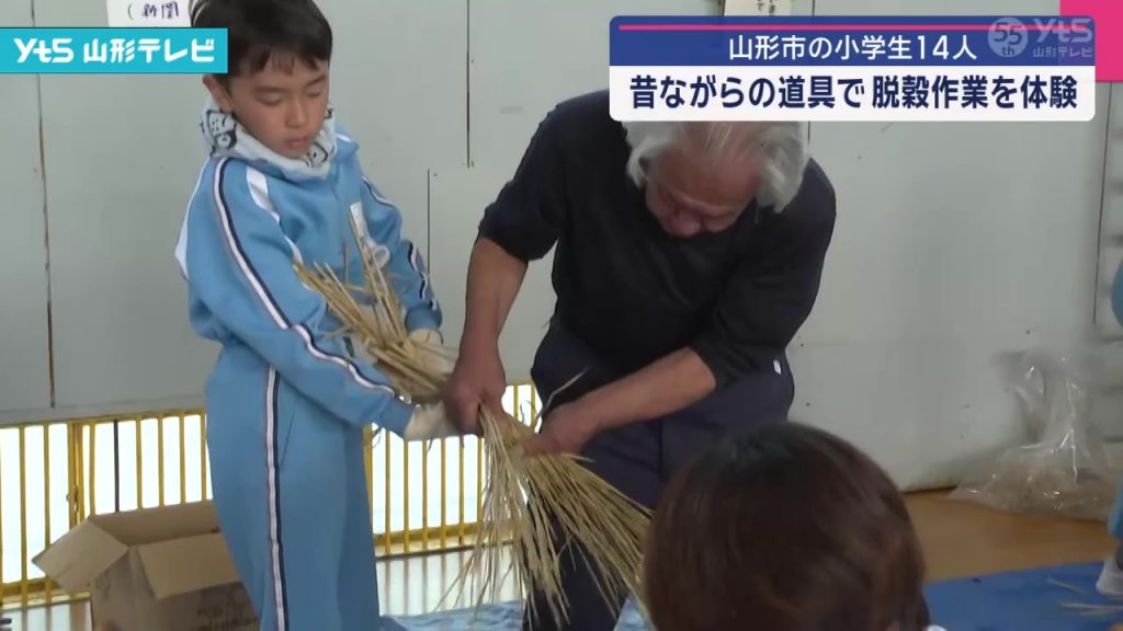 小学生が自分たちで育てたコメの脱穀作業を体験