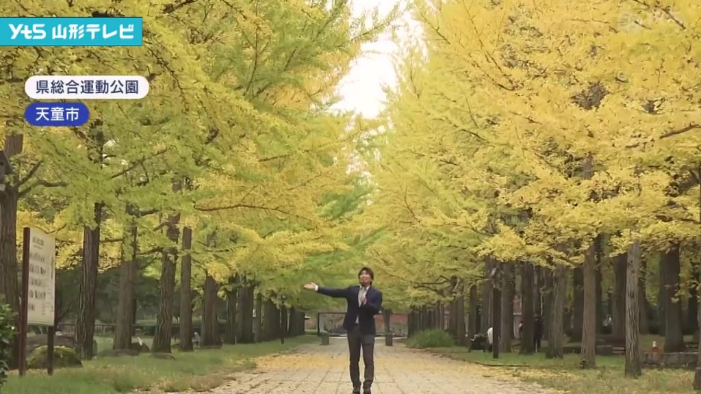 -     天童市の県総合運動公園 イチョウ並木 色鮮やか