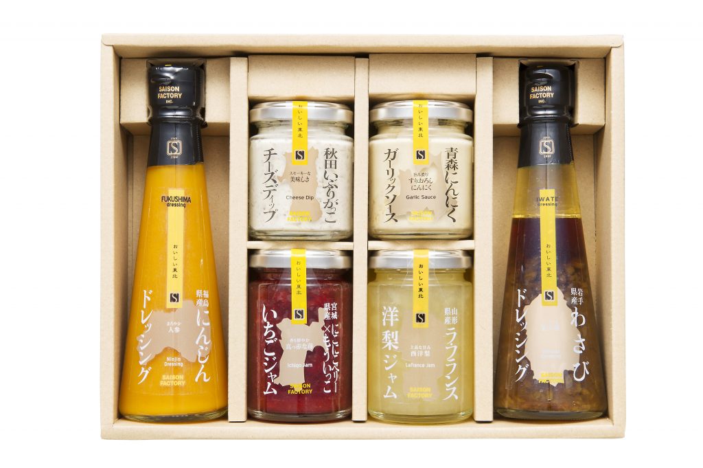 ・セット内容:ドレッシング(福島人参・岩手わさび)各160ml、 秋田いぶりがっこチーズディップ85g、青森ガーリックソース90g、 ジャム(宮城いちご125g、山形ラフランス130g)